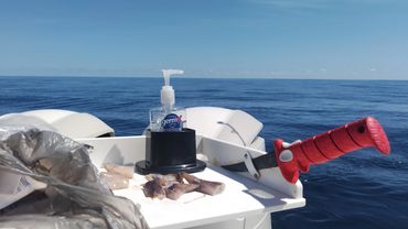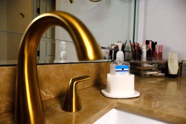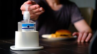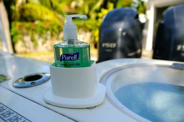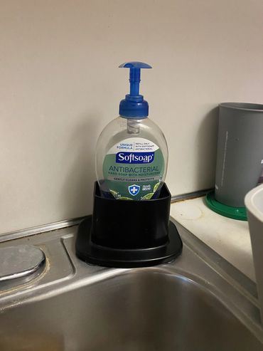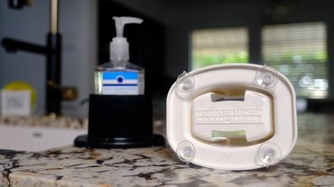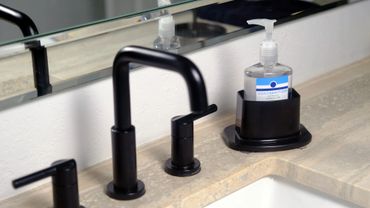 The patent pending design holds liquid soap dispensers and hand sanitizer bottles securely, while preventing them from being easily taken off of